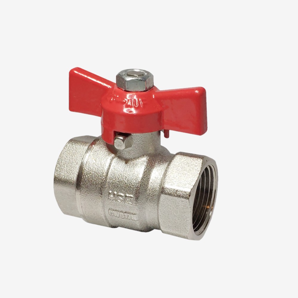 Muffen-Kugelhahn bestehend aus Messing, IG/IG voller Durchgang, für Heizung, Druckluft, Kalt- und Warmwasser. Das Gehäuse sowie die Kugel sind aus Messing CW617N verchromt. Flügelgriff aus Stahl mit einer roten Kunststoffummantelung, silikonfrei. Stopfbuchse nachstellbar